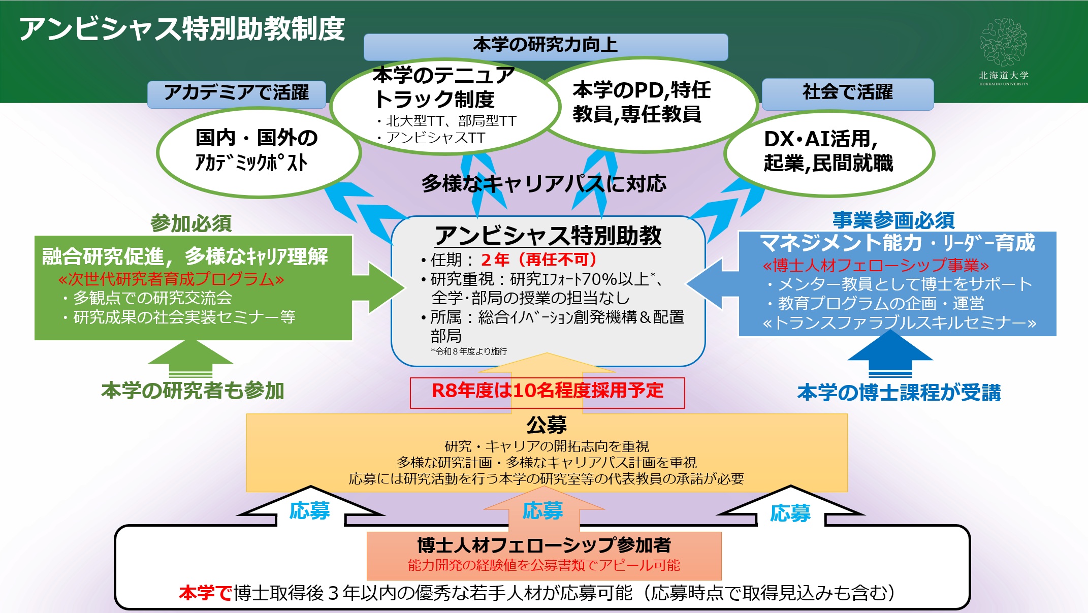 北海道大学では、優秀な博士人材の早期育成と多様なキャリアパス形成を目的としたアンビシャス特別助教(以下「特別助教」)制度を創設しました。特別助教制度は、高い潜在力と研究意欲を持つ優れた博士人材を特任教員として早期に採用・育成することで、本学の研究・教育に寄与できる若手研究者ポストを確保します。特別助教期間中は、最適な研究環境で研究力を向上させるとともに、本学が提供するスキルアッププログラムも実施します。また、特別助教期間後は、部局のアカデミックポストへの応募の他、アカデミックキャリアを生かした起業や民間企業への就職など多様なキャリアパスの拡大も期待できます。特別助教制度によって若手研究者が産業界を含めた多様な社会でリーダーとして活躍できるよう育成することで、世界の課題解決に貢献する人材育成を目指します。